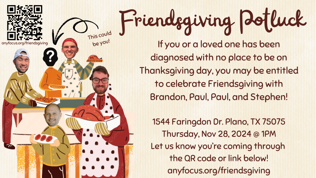 As Thanksgiving is coming up (tomorrow!) I wanted to invite anyone that wanted to, to come hang out at a Friendsgiving potluck that I’m co-hosting with a few special guys on Thanksgiving day! We don’t want anybody celebrating alone, if they don’t want to. :-)